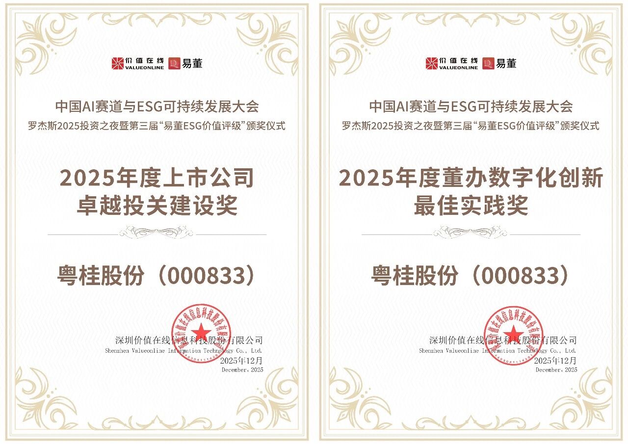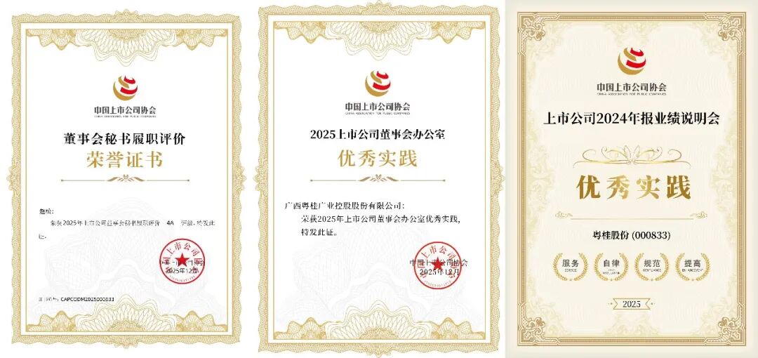 公司持续优化治理结构,完善内控体系,保障运作规范、透明、高效,切实维护全体股东权益。近日,在 中国上市公司协会 近期公布的系列评价中, 粤桂股份 荣获“2025年董事会秘书履职评价4A”及“2025年上市公司董办优秀实践案例”两项荣誉,2024年度业绩说明会亦获评“优秀实践”。上述评价结果,体现了监管机构与行业自律组织对公司规范治理水平、董事会及董秘勤勉履职、投资者关系管理以及信息披露质量的专业认可。