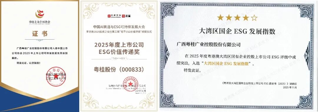 此次系列荣誉的取得,是资本市场对 粤桂股份 近年来在ESG治理、规范运作、价值创造及投资者回报等方面不懈努力的认可。作为国有控股上市公司, 粤桂股份 始终铭记所承担的经济责任、社会责任与环境责任。