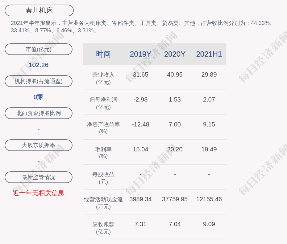 2021年半年报显示,秦川机床的主营业务为机床类、零部件类、工具类、贸易类、其他,占营收比例分别为:44.33%、33.41%、8.77%、6.46%、3.31%。
