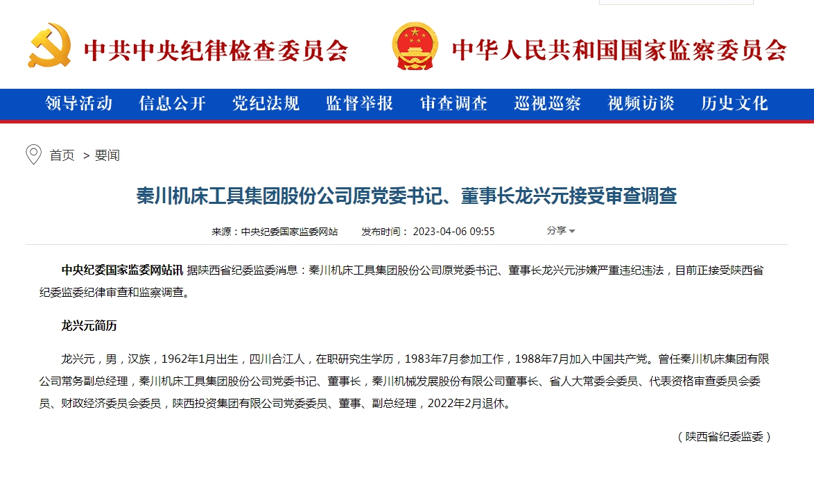 中央纪委国家监委网站6日通报,秦川机床工具集团股份公司原党委书记、董事长龙兴元涉嫌严重违纪违法,目前正接受陕西省纪委监委纪律审查和监察调查。