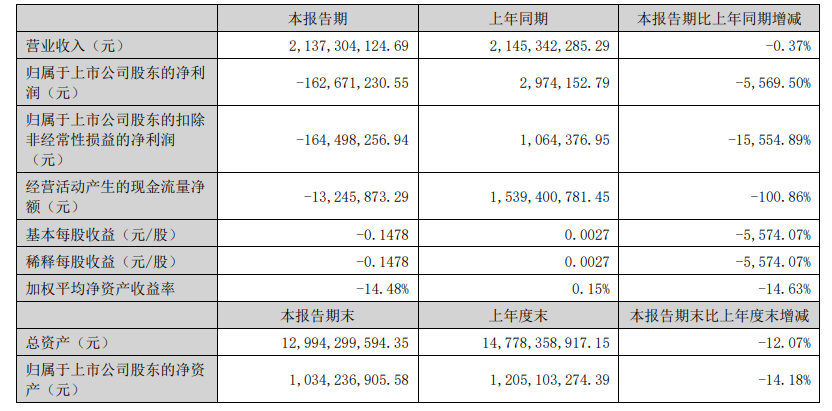 2022年上半年,财信发展营业收入为2,137,304,124.69元,比上年同期下降0.37%;归属于上市公司股东的净利润为-162,671,230.55元,比上年同期下降5,569.50%;归属于上市公司股东的扣除非经常性损益的净利润为-164,498,256.94元,比上年同期减少15,554.89%。