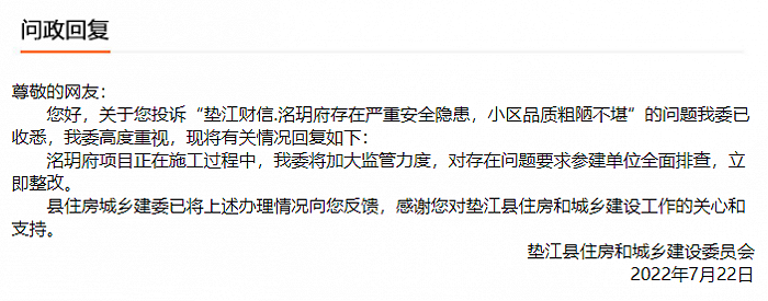 对此,垫江住建委回应到:洺玥府项目正在施工过程中,我委将加大监管力度,对存在问题要求参建单位全面排查,立即整改。