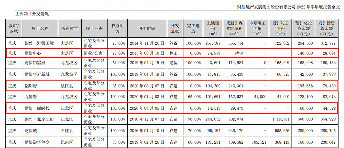 报告中的主要项目开发情况表显示,位于重庆的三个项目——江北区的财信阅时代、垫江县的洺悦府、大足区的财信中心,截至今年上半年的完工进度均为0%,其中大足财信中心的开发进度为“停工”。