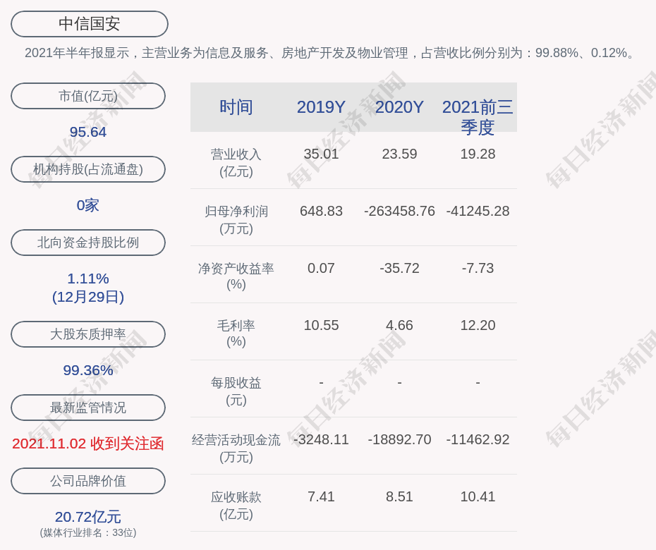 2021年半年报显示,中信国安的主营业务为信息及服务、房地产开发及物业管理,占营收比例分别为:99.88%、0.12%。