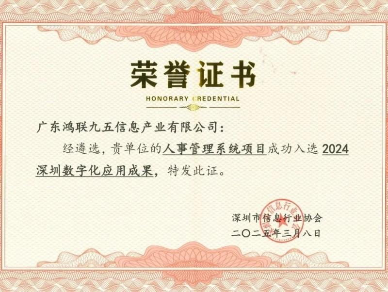 此次入选“2024深圳数字化应用成果”,不仅是对鸿联九五人事管理系统创新性和实用性的高度认可,更是对其在智慧服务领域领先地位的进一步巩固。未来,鸿联九五将继续秉持“服务锲而不舍,品质力臻卓越”的理念,聚焦数智服务,不断提升产品和交付能力。同时,鸿联九五也将积极拓展数智产品矩阵,加速推动现代服务业数智化和客户服务高质量发展,为企业提供更智能、高效的综合解决方案,助力提升企业核心竞争力,为数字经济发展贡献更大力量。