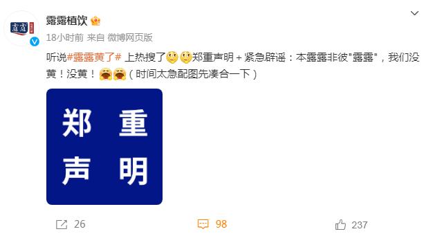 随后,露露植饮在微博回复称,听说#露露黄了#上热搜了[思考][思考]郑重声明+紧急辟谣:本露露非彼"露露",我们没黄!没黄!