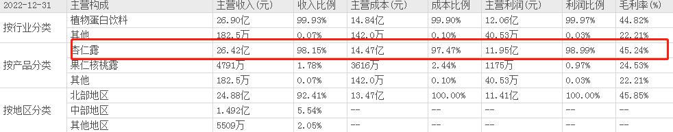 承德露露2022年年报显示,杏仁露全年贡献收入26.42亿元,收入占比98.15%。