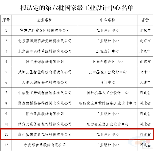 近日,工信部发布了拟认定的第六批国家级工业设计中心名单及拟通过复核的第一批、第二批、第四批国家级工业设计中心名单,其中,唐山冀东装备工程股份有限公司工业设计中心在列。