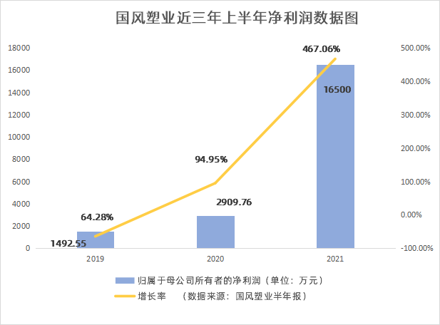 7月6日,国风塑业发布的2021年半年度业绩预告显示,国风塑业2021上半年预计归属于上市公司股东的净利润约1.65亿元,同比增长约470%。