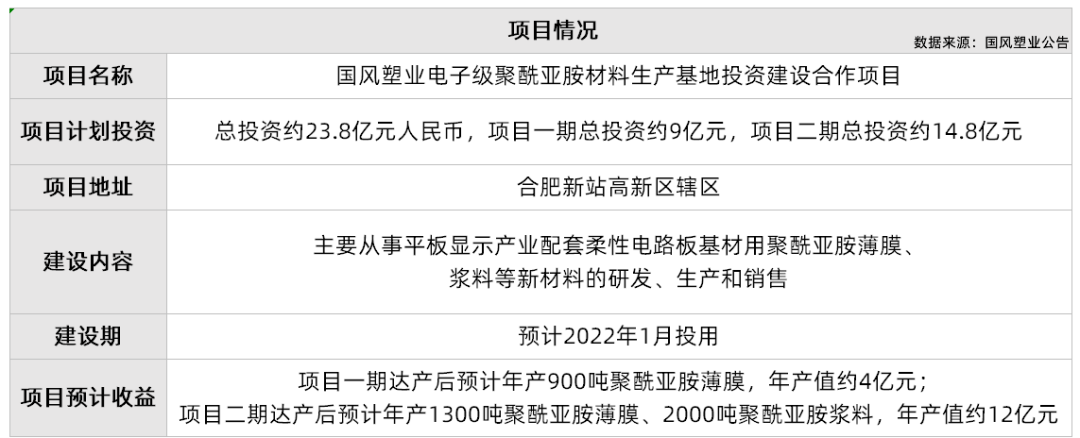 资料显示,今年2月19日,国风塑业电子级聚酰亚胺材料生产基地投资建设合作项目在合肥市政务中心正式签约。