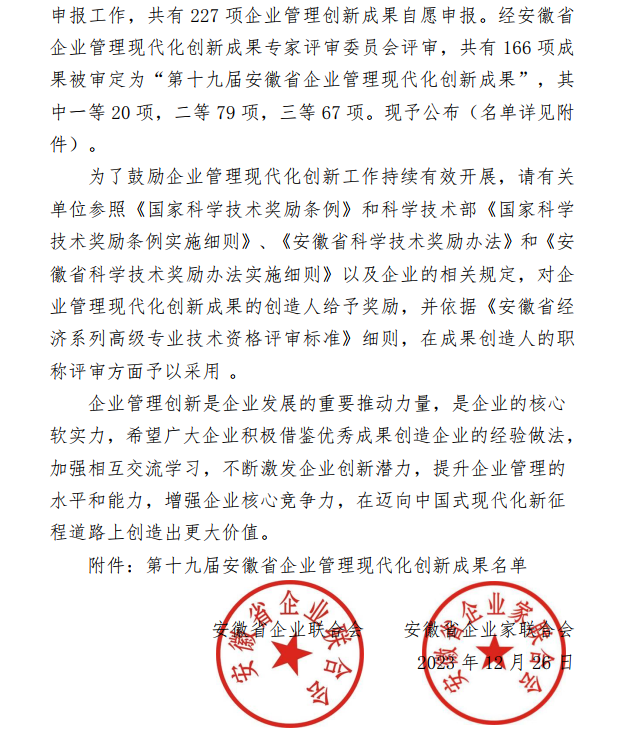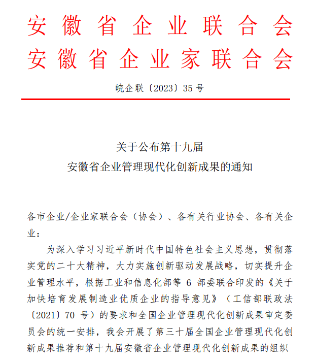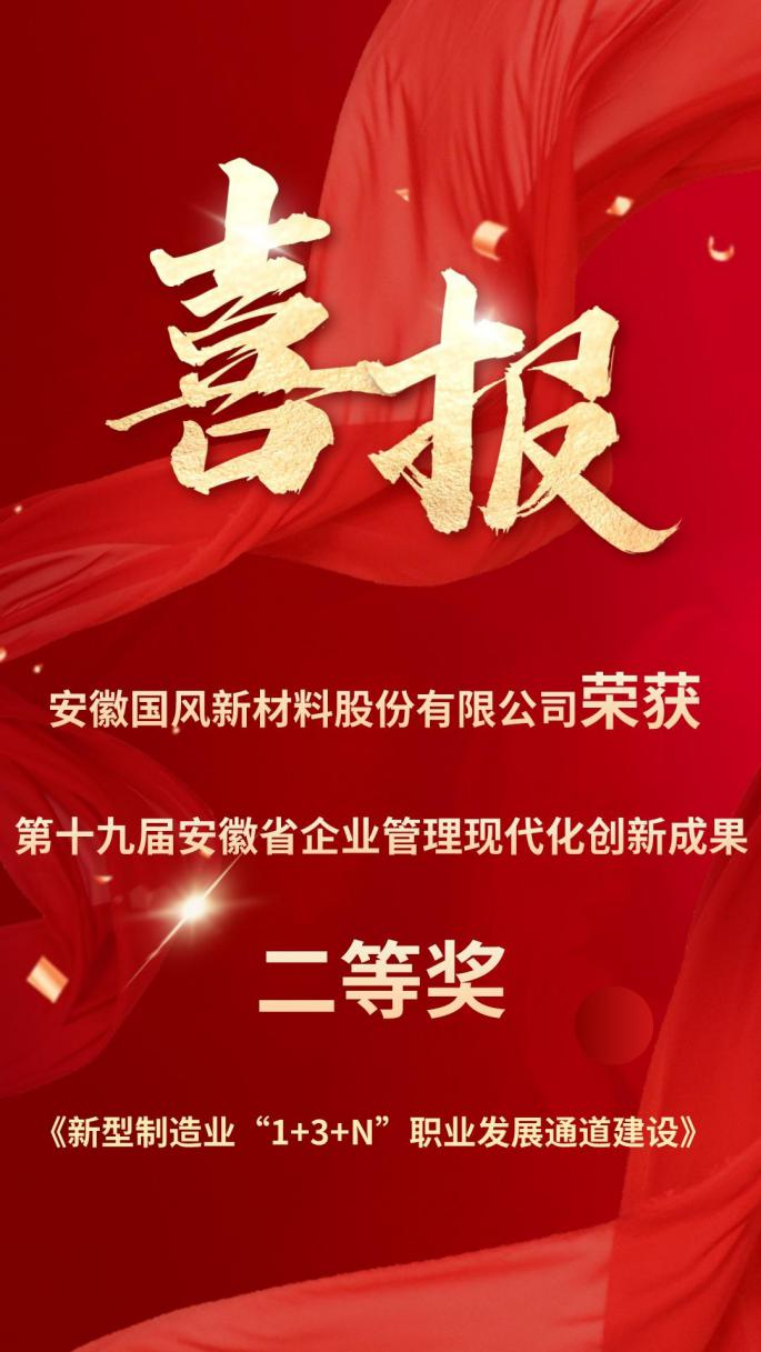 近日,安徽省企业(企业家)联合会公布了第十九届安徽省企业管理现代化创新成果评选结果,经全国企业管理现代化创新成果评审委员会层层筛选,安徽国风新材料股份有限公司成果脱颖而出,申报成果《新型制造业“1+3+N”职业发展通道建设》获得第十九届安徽省企业管理现代化创新成果二等奖。