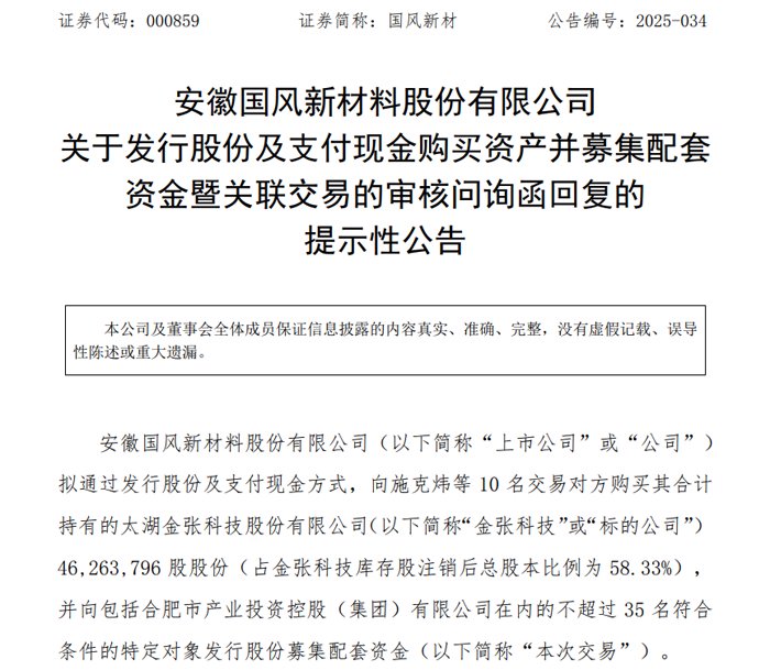 安徽国风新材料股份有限公司拟通过发行股份及支付现金方式,向施克炜等 10 名交易对方购买其合计持有的太湖金张科技股份有限公司46,263,796 股股份(占金张科技库存股注销后总股本比例为 58.33%),并向包括合肥市产业投资控股(集团)有限公司在内的不超过 35 名符合条件的特定对象发行股份募集配套资金不超过 3.51亿元。本次交易完成后,金张科技将成为上市公司的控股子公司。