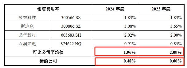 同时,标的公司报告期各期的销售费用率也均明显低于可比公司平均值水平,且在公司营收实现双位数增长,但其销售费用却同样不增反降的情况下,也能较好地侧面说明报告期内标的公司营业收入持续增长的合理性存疑。以2024年为例,根据重组报告书相关数据显示,所选取各大可比公司的销售费用率处于0.91%-3.08%区间,均显著高于标的公司仅0.48%的同期销售费用率,其可比公司1.96%的销售费用率平均值水平为标的公司的4.08倍之多。基于以上分析,标的公司远低于可比公司平均值水平的销售费用率是否符合行业惯例,其仅仅315.80万元的销售费用是否能够支撑起公司高达65,609.70万元的营收规模仍然待考。