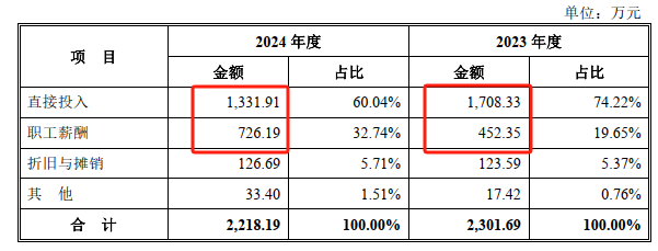 且就其构成来看,所披露标的公司主要研发费用项目的变动趋势也难以形成较好自洽。2024年,标的公司研发费用中的职工薪酬大幅增长至726.19万元,同比大幅提升60.54%。据此,我们可以合理推断标的公司当年的研发人员规模理应得到较大扩充,但令人匪夷所思的是,反观标的公司同期直接投入的金额却出现显著减少至1,331.91万元,同比下降达22.03%。而在研发人员大幅扩充但其研发直接投入金额反倒出现显著减少之下,也不得不令人质疑标的公司研发费用中职工薪酬数据的真实性,是否存在硬凑研发人员、导致职工薪酬注水虚高的可能性有待于相关进一步披露解释。