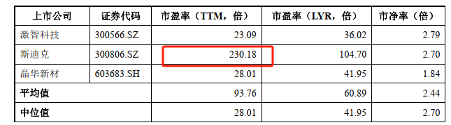 另一方面,从市场法评估来看,评估机构所选取可比公司的可参考性同样存疑。此次市场法测算中,评估机构选取了激智科技、斯迪克、晶华新材三家企业作为可比公司。而值得注意的是,根据重组报告书显示,前述三家可比公司于评估基准日的市盈率(TTM)分别为23.09、230.18、28.01,可以看到其中斯迪克的市盈率已经显著大幅高于另外两家可比公司,分别为激智科技的约10倍、晶华新材的约8倍之多。而从可比公司价值比率计算结果来看,斯迪克EV/EBITDA价值比率则为21.69,同样也显著高于激智科技、晶华新材分别为14.30、15.48的价值比率。基于以上分析、评估机构所选取可比公司斯迪克的合理性,与其价值比率的可参考性均可能较低。