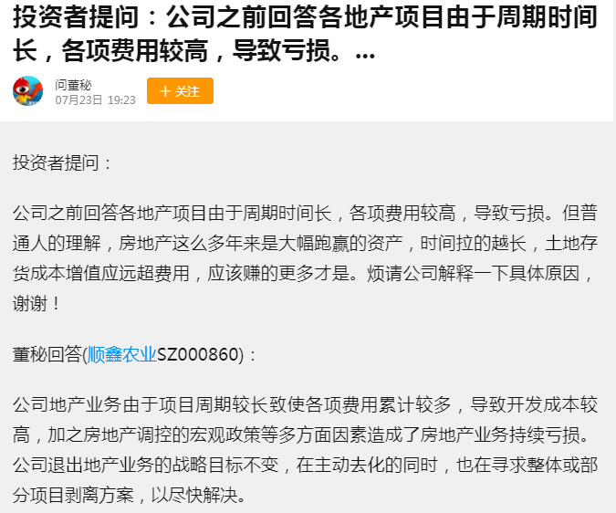 7月23日,顺鑫农业在投资者互动平台表示,公司地产业务由于项目周期较长致使各项费用累计较多,导致开发成本较高,加之房地产调控的宏观政策等多方面因素造成了房地产业务持续亏损。