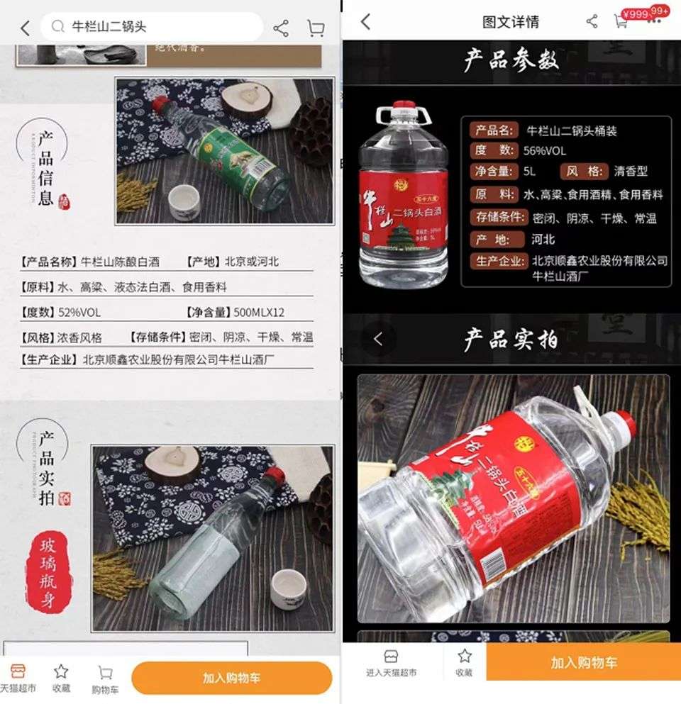 鳌头财经发现,在天猫超市,一款售价185元12瓶的“牛栏山陈酿白酒”,其原料中包含“食用香料”。而且售价63.6元的一款桶装“牛栏山二锅头白酒”中,也有标明含“食用香料”。