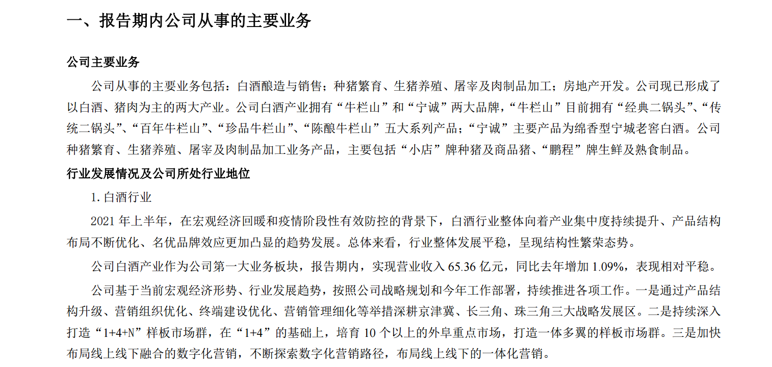 公告资料显示,顺鑫农业现已形成了以白酒、猪肉为主的两大产业,公司白酒产业拥有“牛栏山”和“宁城”两大品牌,“牛栏山”目前拥有“经典二锅头”“传统二锅头”“百年牛栏山”“珍品牛栏山”“陈酿牛栏山”五大系列产品;;“宁城”主要产品为绵香型宁城老窖白酒。