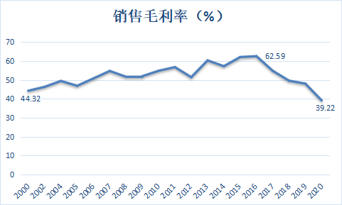 2016-2020年,顺鑫农业的销售毛利率分别为62.59%、54.86%、49.63%、48.08%、39.22%。近5年公司销售毛利率呈明显的下降趋势。