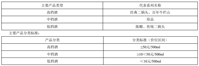 据了解,顺鑫农业将每500毫升大于等于50元的产品列为高档酒,每500毫升小于50元且大于等于10元的产品列为中档酒,每500毫升小于10元的产品列为低档酒。而经典二锅头、百年牛栏山为公司高档酒,珍品为公司的中档酒,低档酒则主要以陈酿、传统二锅头为主。