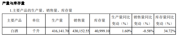 2021年半年报显示,公司白酒业务实现营业收入为65.36亿元,同比仅增加1.09%。与此同时,公司产销量也陷入了停滞。产量同比仅微增1.6%,销量则同比下降了0.58%。最终留下同比大增的也唯有库存量。