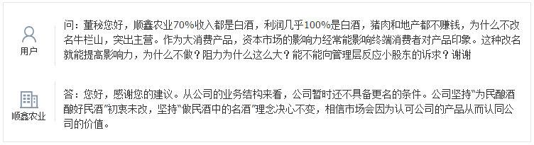 由于横跨酒、肉、房三条产业赛道,这也成为了顺鑫农业暂时不具备更名的条件。顺鑫农业对此也并不讳言,在投资者互动平台上积极回复,有问必答。