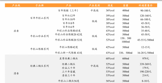 顺鑫农业旗下拥有牛栏山及宁诚老窖两大白酒品牌,其中牛栏山为低档酒为主(为白酒业务收入及利润主要来源),宁诚老窖以中高档酒为主(2007年末被公司收购,“宁诚”牌在内蒙古及东北地区拥有较高市场知名度,但目前规模较小)。具体来看,牛栏山分为浓香型与清香型两大类产品线,产品价格覆盖全价格带,白牛二收入占比接近80%,为实现全国化的战略性单品。