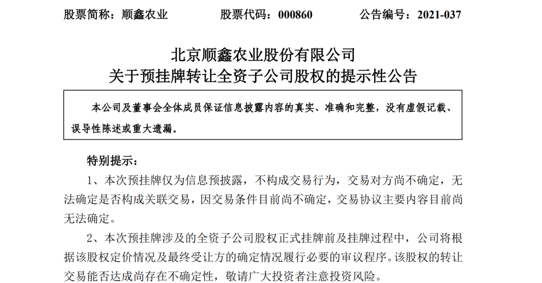 近日,顺鑫农业发布预挂牌公告称,为聚焦主营业务,公司拟通过产权交易所公开挂牌转让全资子公司北京顺鑫佳宇房地产开发有限公司(下称“顺鑫佳宇”)100%的股权。