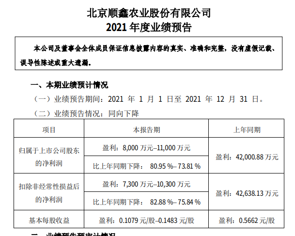 1月24日晚间,顺鑫农业公布了一份惊天地泣鬼神的业绩预告。预计2021年全年净利润8000万-1.1亿,同比下降80.95%–73.81%;扣非净利润7300万–1.03亿元,同比下降82.88%–75.84%。一幅彻底摆烂的姿态,着实让人有些措手不及。