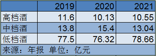 这一定程度上与疫情后低端酒行业整体表现不佳有关,2020年A股上市公司中低端酒占比巨大的酒企如迎驾贡酒、老白干酒、伊力特营收均在下滑,2021年营收增速同样垫底。