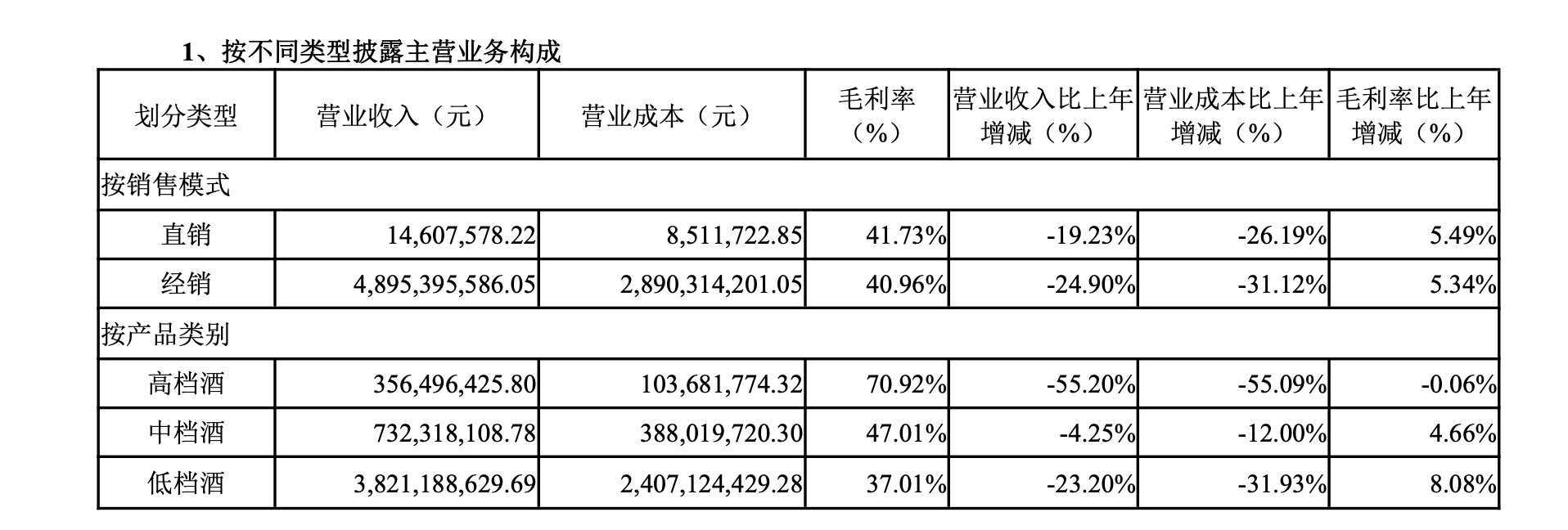 从各档销售产品来看,牛栏山酒厂全线产品营收均呈现下降趋势。根据公告显示,今年上半年,牛栏山高档酒、中档酒以及低档酒分别实现营业收入3.56亿元、7.32亿元以及38.21亿元,同比下降55.2%、4.25%以及23.2%。从销售模式来看,1-6月,牛栏山直销、经销模式分别实现营业收入0.15亿元、48.95亿元,同比下降19.23%、24.9%。