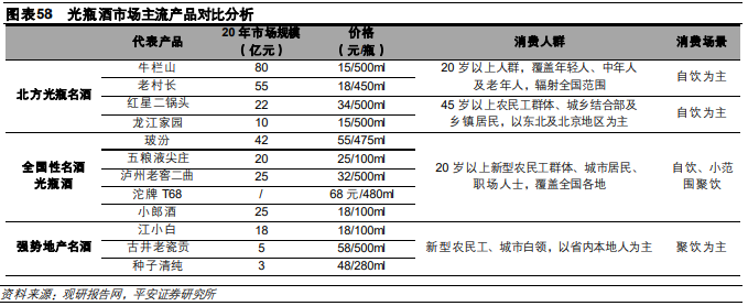 比如近几年,老村长,江小白、小郎酒、玻汾等发展势头强劲,凭借精确的定位畅销全国,夺取了光瓶酒不少的市场份额。