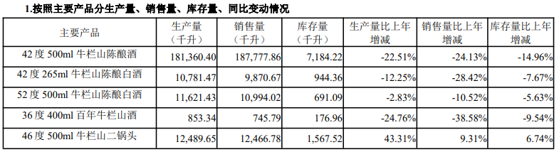 比如,42度500ml牛栏山陈酿酒、36度400ml百年牛栏山酒销售量均比上年分别下降了24.13%和38.58%;仅46度500ml牛栏山二锅头销售量实现正增长,比上年增长9.31%。