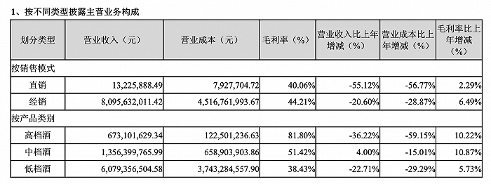 根据2022年财报显示,从各档位产品来看,去年全年牛栏山在高档酒、中档酒以及低档酒方面,分别实现营业收入6.73亿元、13.56亿元以及60.79亿元,同比提升-36.22%、4.00%以及-22.71%。