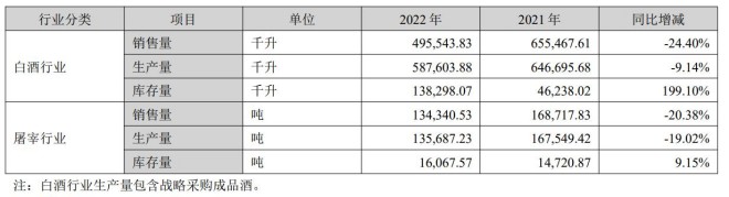 顺鑫农业表示,白酒行业期末库存量比去年同期增长199.10%,主要由于增加储备所致。从白酒产销情况看,2022年产量为5.88亿升,比上年减少了9.14%;销量为4.96亿升,同比减少24.40%。产量高于销量,导致库存量出现了大幅增长,年末还有库存1.38亿升。