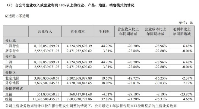 2022年度,顺鑫农业的白酒业务实现营业收入81.09亿元,和上一年度相比减少20.70%;猪肉产业实现营业收入27.23亿元,同比去年减少24.40%,其中屠宰业务收入为25.56亿元,同比减少22.84%,种畜养殖业务收入为1.67亿元。白酒和猪肉(肉食)产业营业收入分别占公司整体营业收入的69.44%和23.32%,合计超过九成。