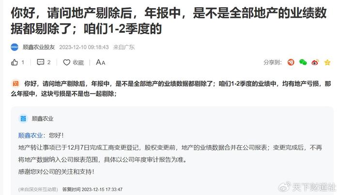 12月15日,有投资者在互动平台对顺鑫农业(000860.SZ)提问:“年报中是不是剔除全部地产的业绩数据?1-2季度地产亏损的数据是不是也一起剔除?”。