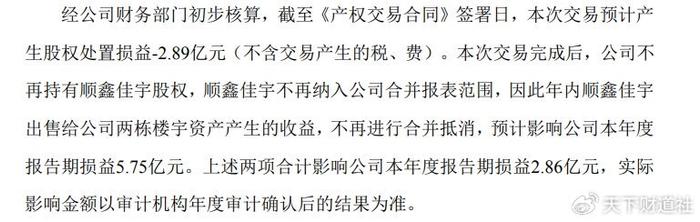 顺鑫农业在11月25日的挂牌交易进展公告中表示,经初步核算,此次交易预计产生股权处置损益约-3亿元。并同时表示,年内顺鑫佳宇出售给公司两栋楼宇资产产生的收益,不再进行合并抵消,预计影响公司本年度报告期损益约6亿元。