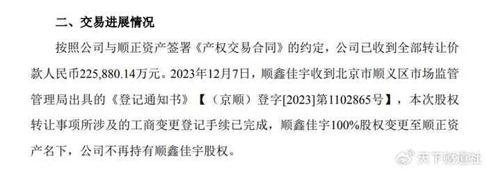 12月7日盘后,顺鑫农业发布公告表示,全资子公司北京顺鑫佳宇房地产开发有限公司(下称“顺鑫佳宇”)100%股权转让事项,已完成工商变更登记。