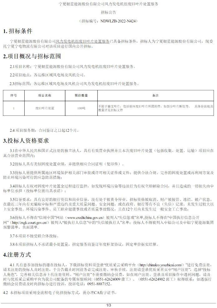 8月3日,宁夏银星能源股份有限公司风力发电机组废旧叶片处置服务招标公告。根据公告,银星能源拟对100吨废旧叶片处置进行招标,不限于整支叶片,包括损坏废旧叶片所属附件,如部分叶片断肢等。