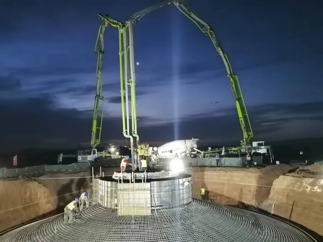 风机基础浇筑前,项目部精心组织、提前筹划,多次组织参建各方召开大体积混凝土施工技术方案讨论会、浇筑前资源措施协调会、现场技术交底会等,对影响基础浇筑的关键环节仔细分析,对风机基础施工人员、材料、机械、施工方法、当日的天气环境及其他可能出现的风险因素逐一进行排查、评估,制定相应保障措施和应急预案,还根据以往基础浇筑做法,总结出了“夜间浇筑不堵车,罐车多、不加满”的经验,要求施工单位联系20辆以上混凝土罐车保障混凝土浇筑,确保了首台风机基础混凝土浇筑的连续紧凑,为实现基础顺利浇筑、后期实现吊装施工奠定坚实基础。