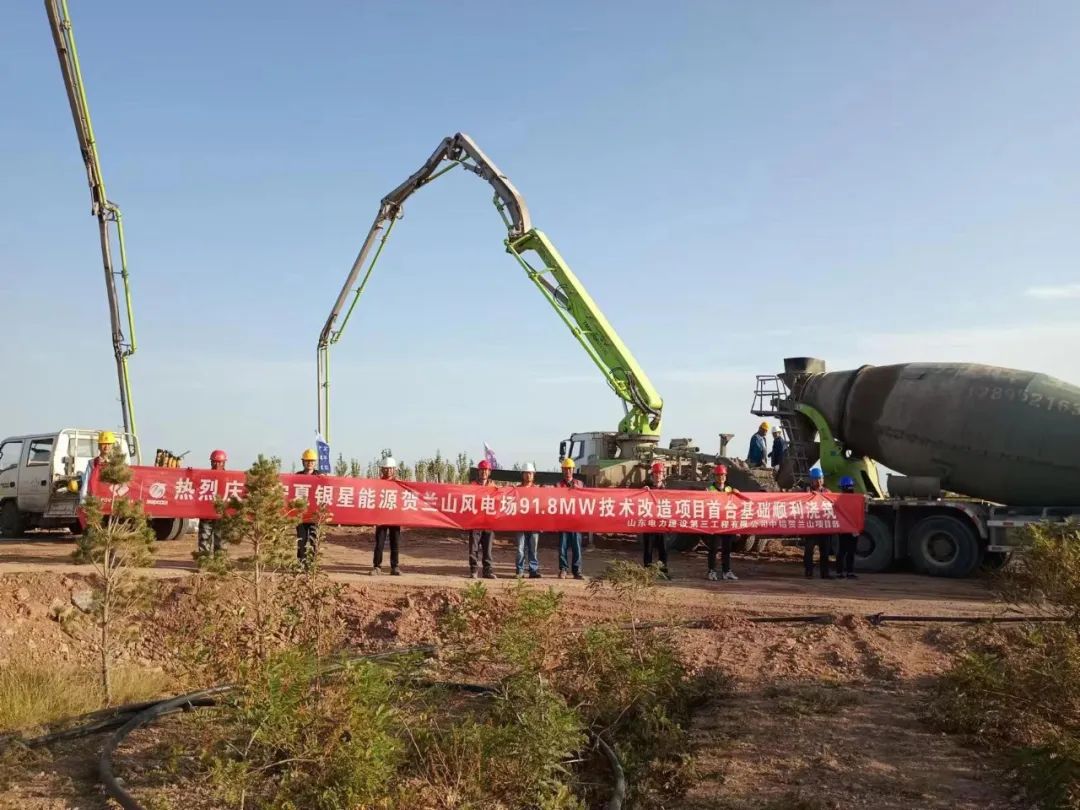 9月16日17:17,在贺兰山风电场浇筑现场,随着一声号令,就位的两台混凝土泵车分开架设形成“龙门”阵势,陆续向首台基础开始注入混凝土,9月17日06:16,首台风机基础施工顺利完成,标志着银星能源贺兰山风电厂91.8MW技术项目正式进入风机基础施工阶段。