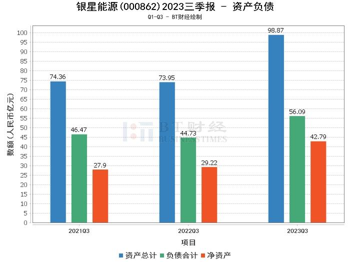 从资产负债方面来看,银星能源2023年三季度末的总资产为98.87亿元,相比上年度末的89.67亿元有所增长。负债总额为56.09亿元,与上年度末的56.29亿元相比略有下降。净资产为42.79亿元,较上年度末的33.38亿元有显著提升。资产负债率为56.73%,较上年度末的62.78%有所下降,显示出公司负债结构的改善。
