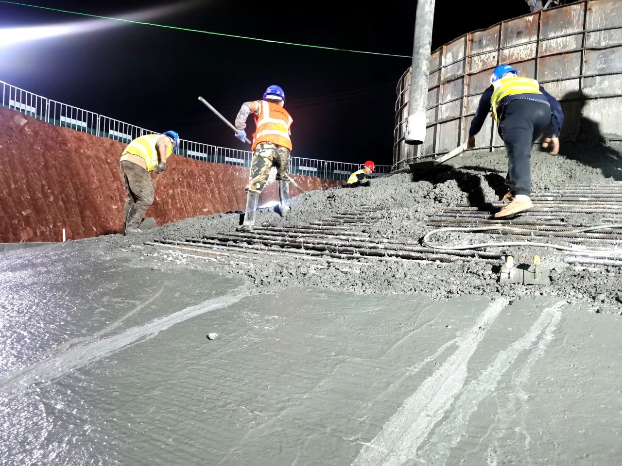 浇筑过程中,项目部分工协作、严控质量:一路驻守商混站,全程监控混凝土配合比和罐车调度;另一路坚守现场,严格监督混凝土坍落度检测、试块取样及振捣工艺,确保锚栓笼处混凝土密实度和环形摊铺质量。安全管理方面,项目部多措并举,实施"四重防护"(电子围栏+物理隔离+专人巡查+智能监控),推行"一人一码"实名制管理,实现人员精准定位,确保了施工现场安全高效推进。