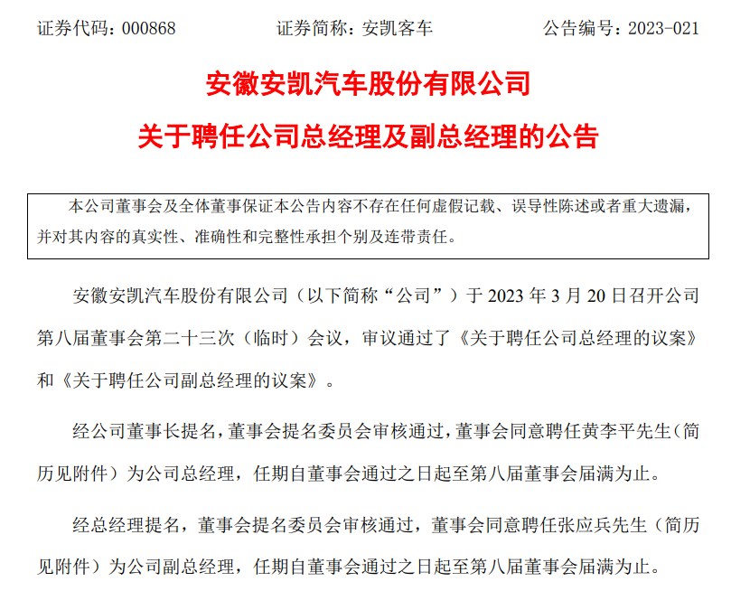 安徽安凯汽车股份有限公司(以下简称“公司”)于2023年3月20日召开公司第八届董事会第二十三次(临时)会议,审议通过了《关于聘任公司总经理的议案》和《关于聘任公司副总经理的议案》。