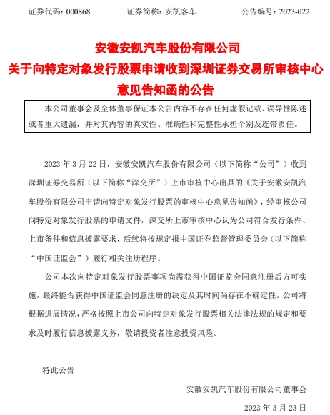 安凯客车(000868.SZ)于昨日晚间发布公告,公司收到深交所上市审核中心出具的《关于安徽安凯汽车股份有限公司申请向特定对象发行股票的审核中心意见告知函》,经审核公司向特定对象发行股票的申请文件,深交所上市审核中心认为公司符合发行条件、上市条件和信息披露要求,后续将按规定报中国证监会履行相关注册程序。