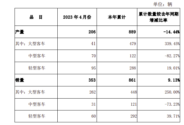 安凯客车5月5日公告,公司4月销量353辆,本年累计销量861辆,本年累计销量同比增长9.13%。