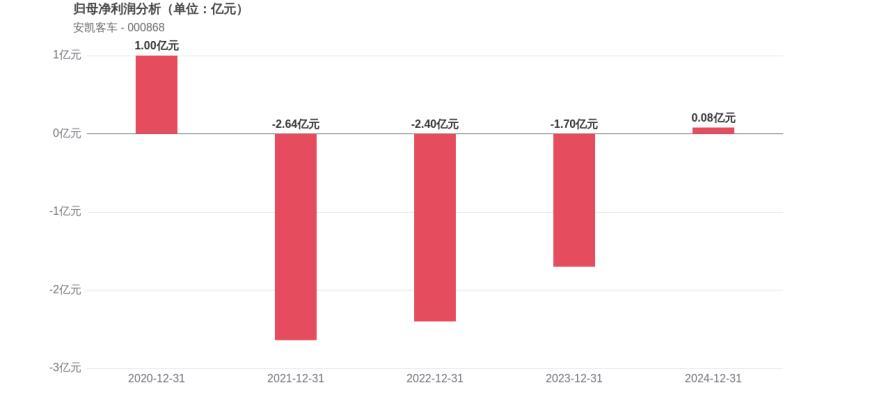 利润角度分析,2020年安凯客车实现归母净利润1.00亿元,2024年0.08亿元。盈利能力明显下滑。