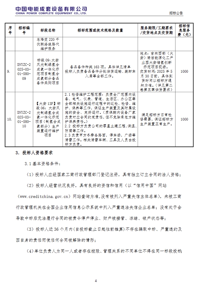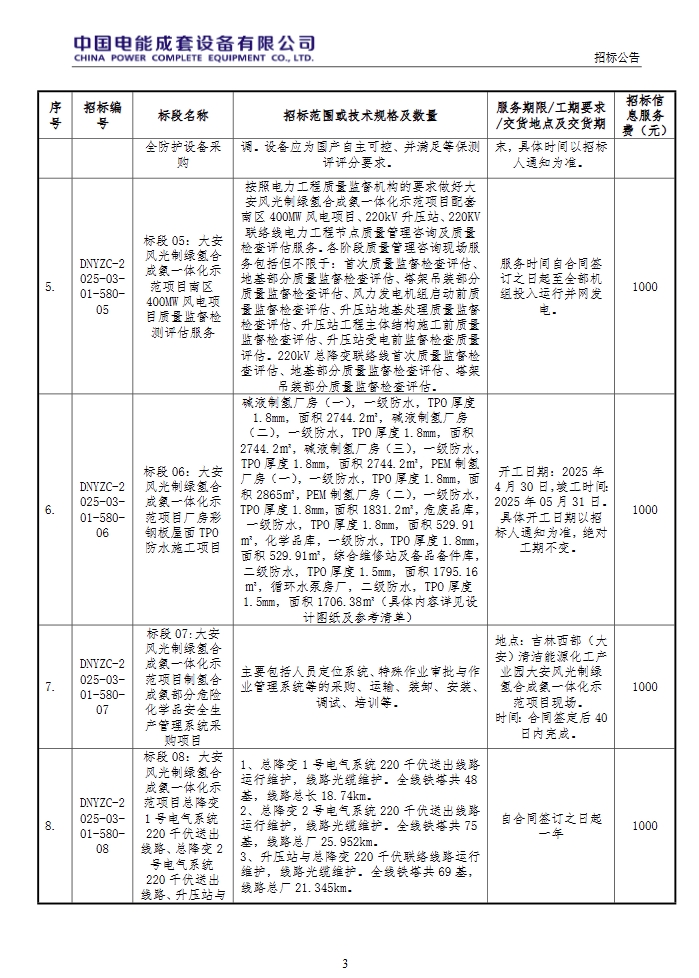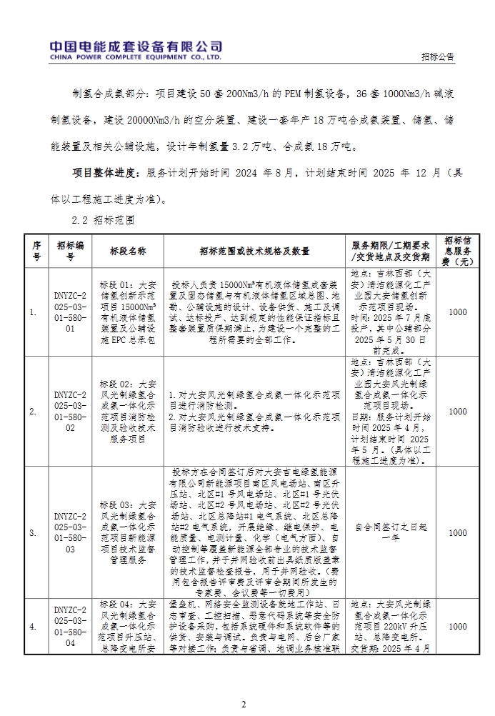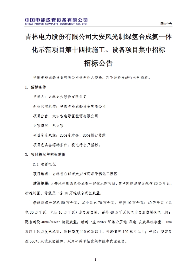 3月17日,吉林电力股份有限公司发布大安风光制绿氢合成氨一体化示范项目,第十四批施工、设备项目集中招标公告。该项目位于吉林省白城市大安市两家子镇化工园区,服务计划开始时间2024年8月,计划结束时间2025年12月(具体以工程施工进度为准)。
