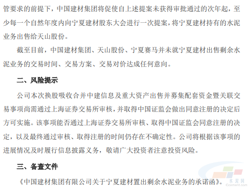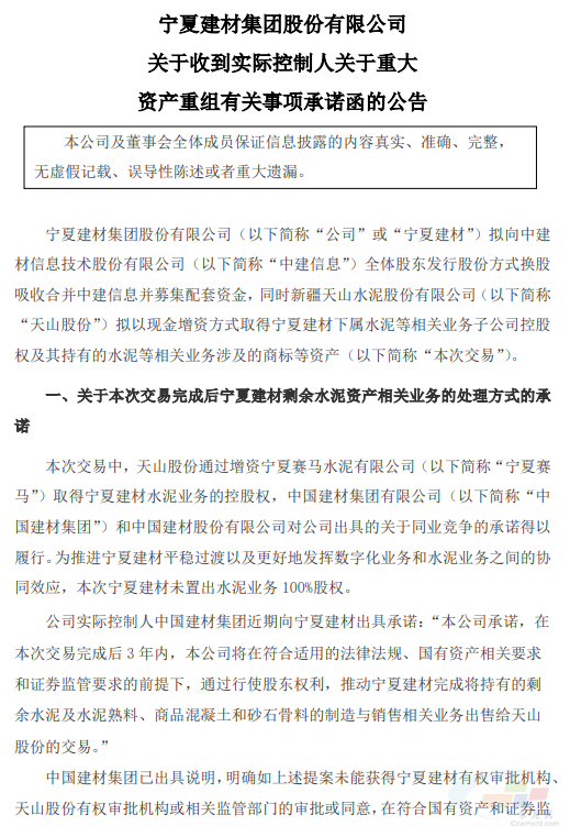 公司实际控制人中国建材集团近期向宁夏建材出具承诺:“本公司承诺,在本次交易完成后3年内,本公司将在符合适用的法律法规、国有资产相关要求和证券监管要求的前提下,通过行使股东权利,推动宁夏建材完成将持有的剩余水泥及水泥熟料、商品混凝土和砂石骨料的制造与销售相关业务出售给天山股份的交易。”